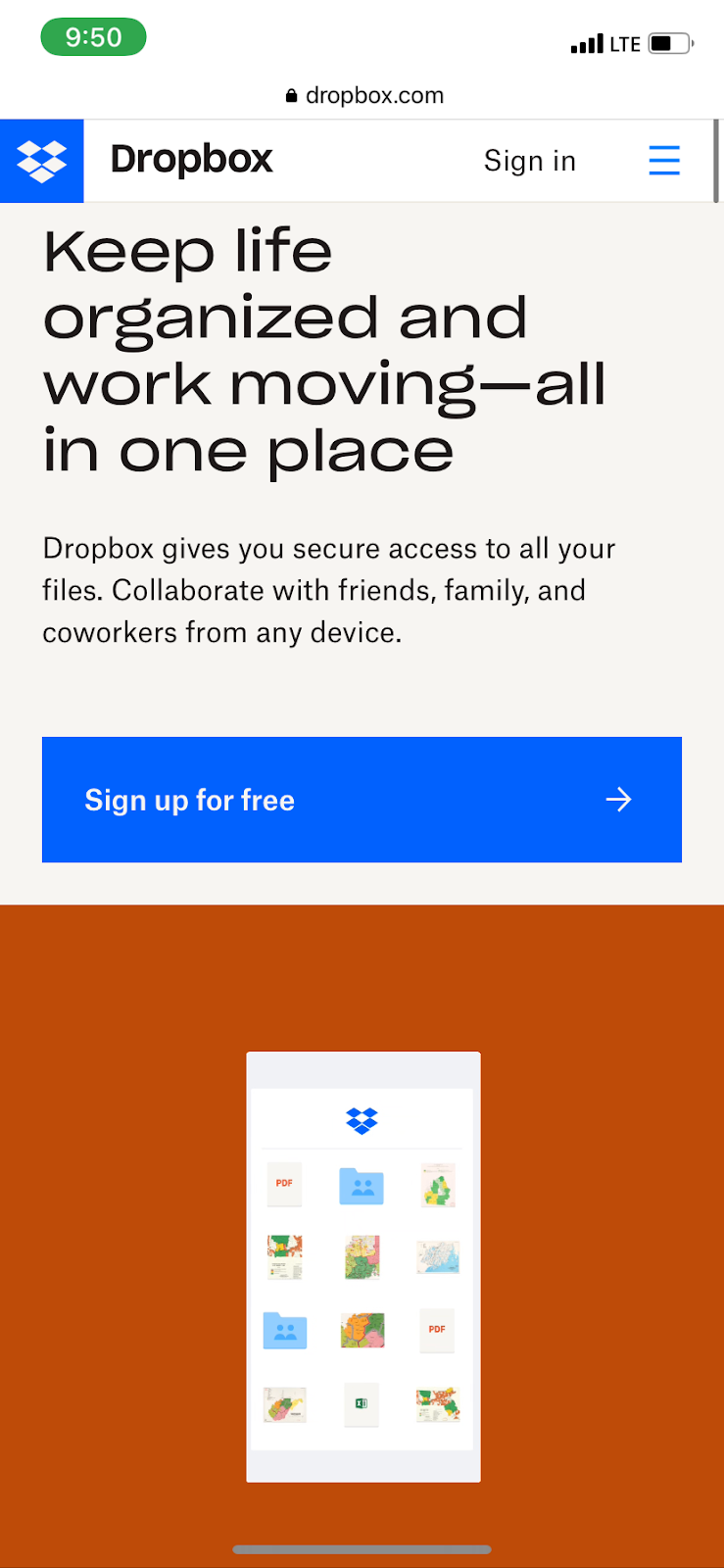 Dropbox has taken great strides to enhance the mobile experience. They have short and sweet tagline, a mobile-friendly gif, and a big button that takes users to a free trial.