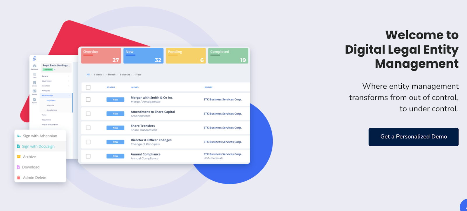 Their play on being out of versus in control is memorable, and the screenshot of their product shows how streamlined entity management can be.