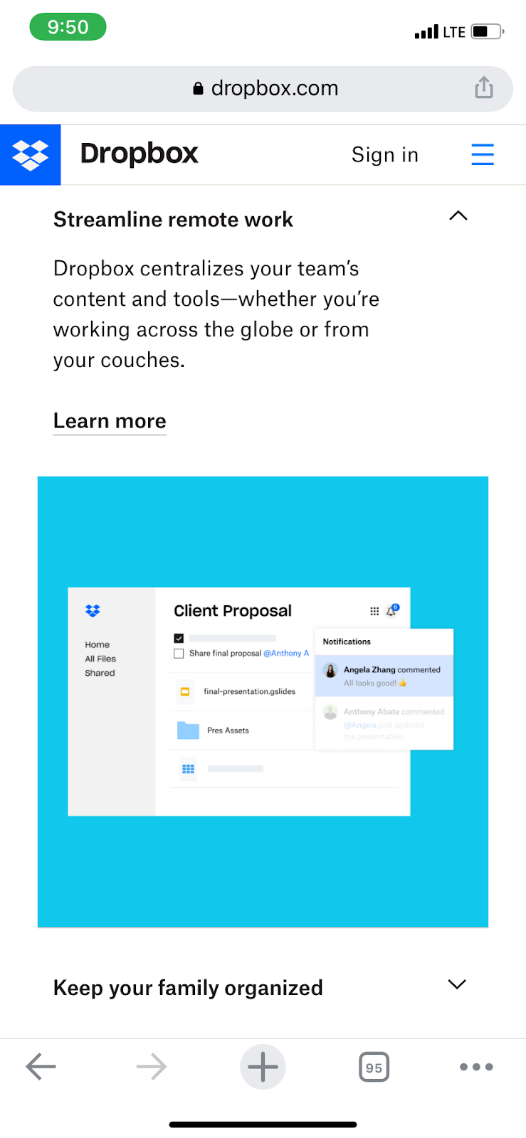 Their mobile site is optimized for readability, with a few short sentences to explain exactly how their product streamlines remote work, keeps your family organized, and more with carrots to expand or contract information when you need to.