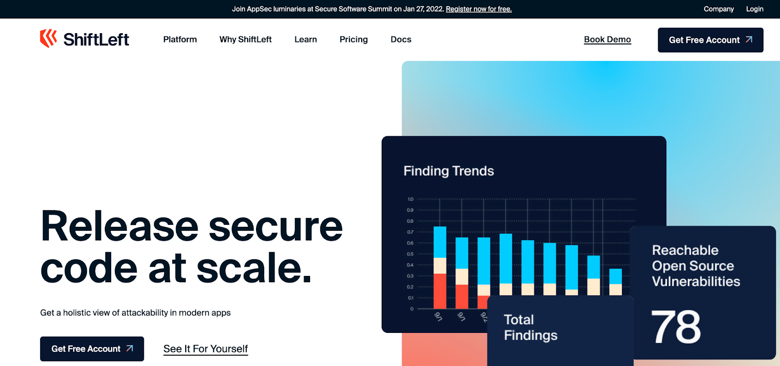 At the very top, you see a banner inviting users to register for the Secure Software Summit. There, prospects can learn more about what ShiftLeft does and how it might benefit their business.