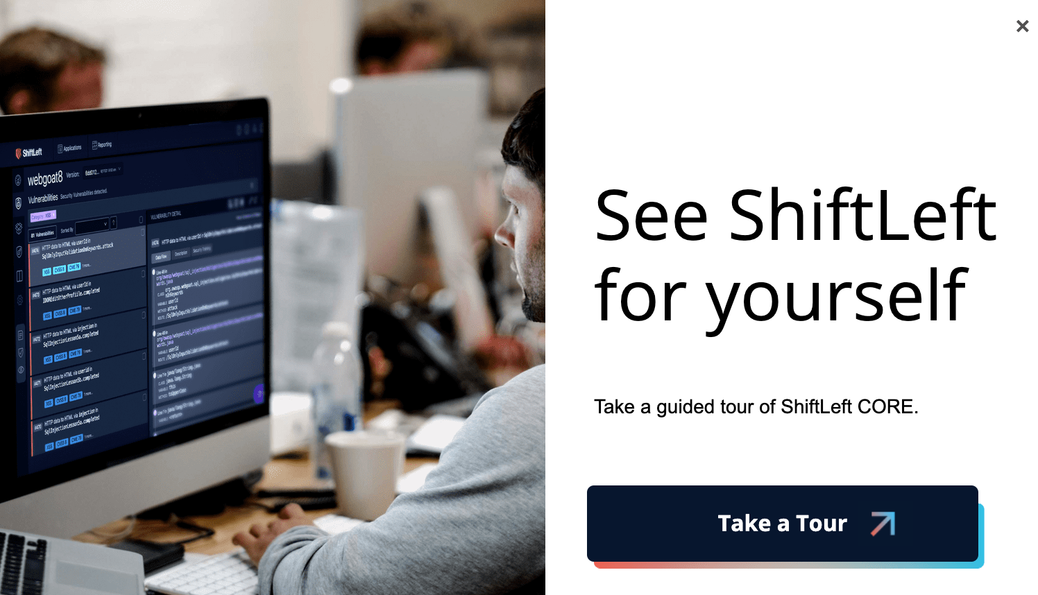 As users scroll, they come across two more CTAs一another Get Free Account button, and a See it For Yourself link. Again, users are presented with an option: do a ShiftLeft test drive themselves or walk through a product tour.