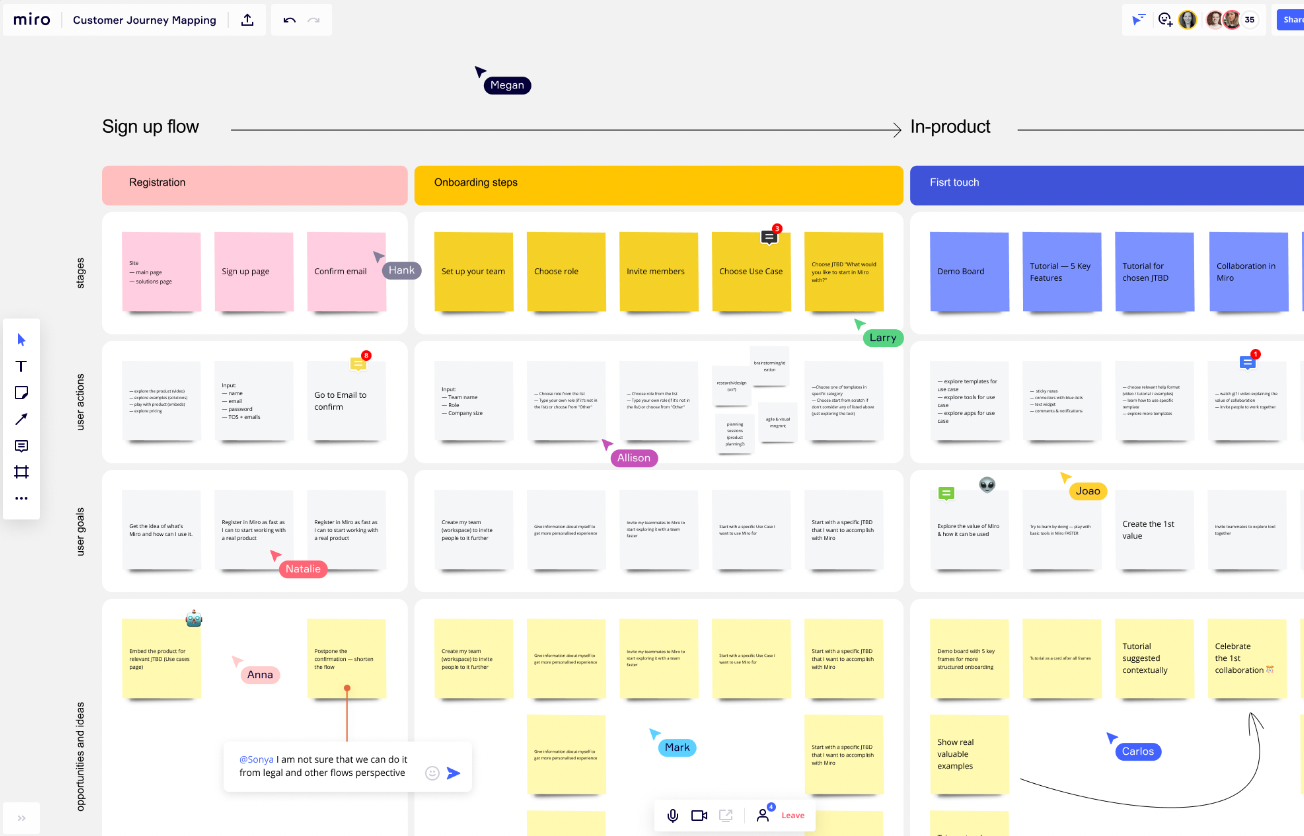 So go through the onboarding experience yourself with your research notes and numbers on-hand. Templates from Figma, or Miro flows like the one below can be really helpful here.